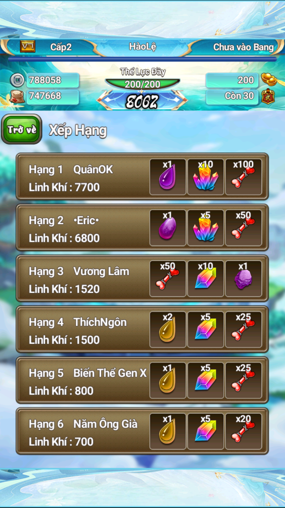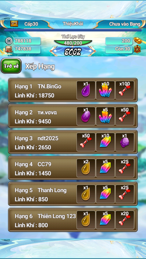 Danh sách top 20 người chơi trên toàn server có số điểm tụ linh cao nhất