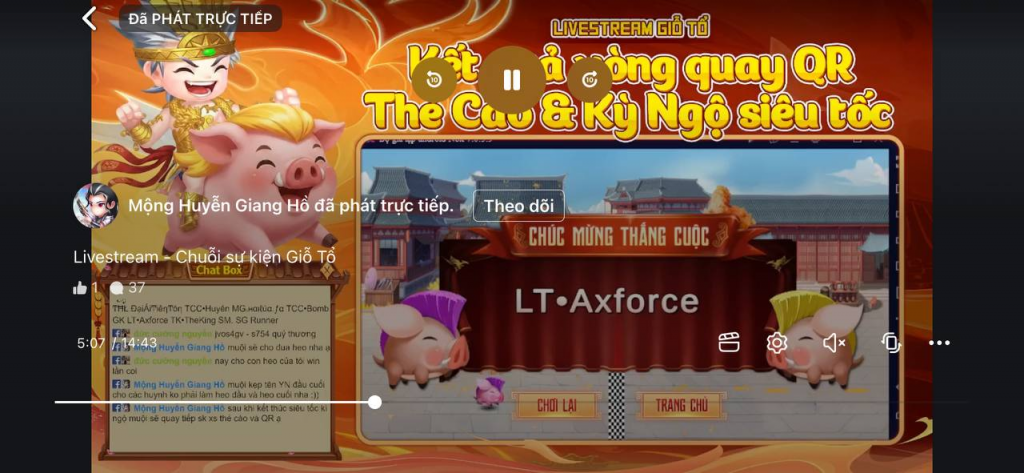 Theo đó, muội đã tiến hành livestream đua heo để tìm ra thêm 1 sư huynh may mắn nhận phần thưởng may mắn của sư kiện mốc 750.000 và ghi nhận sư huynh may mắn thắng sự kiện là:
