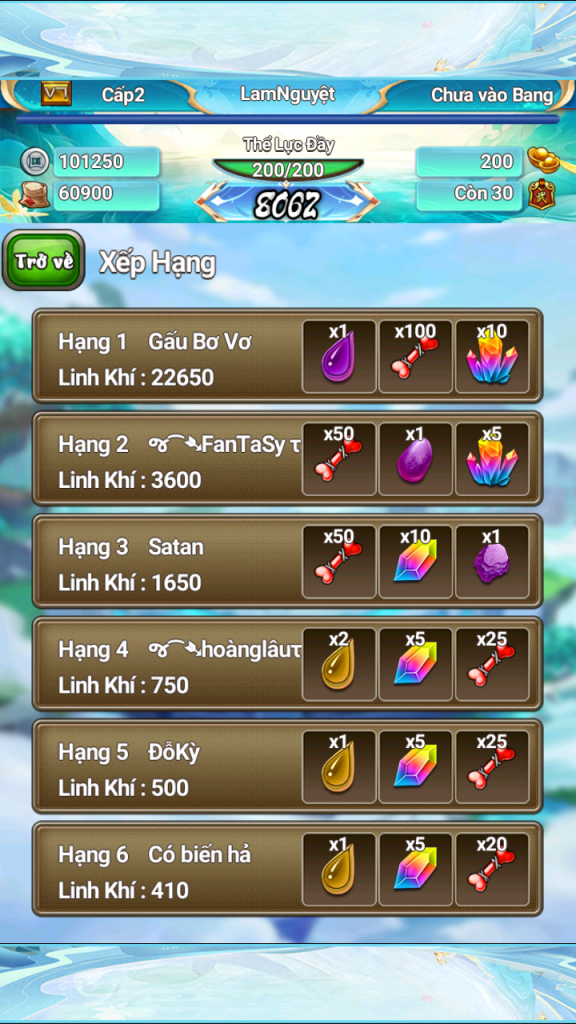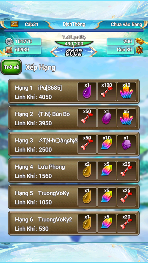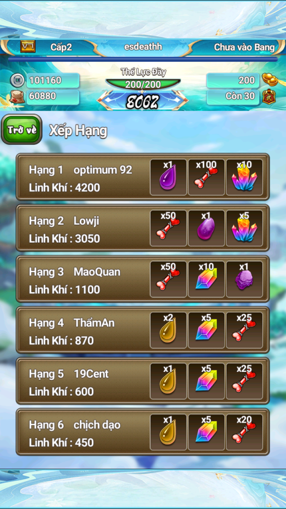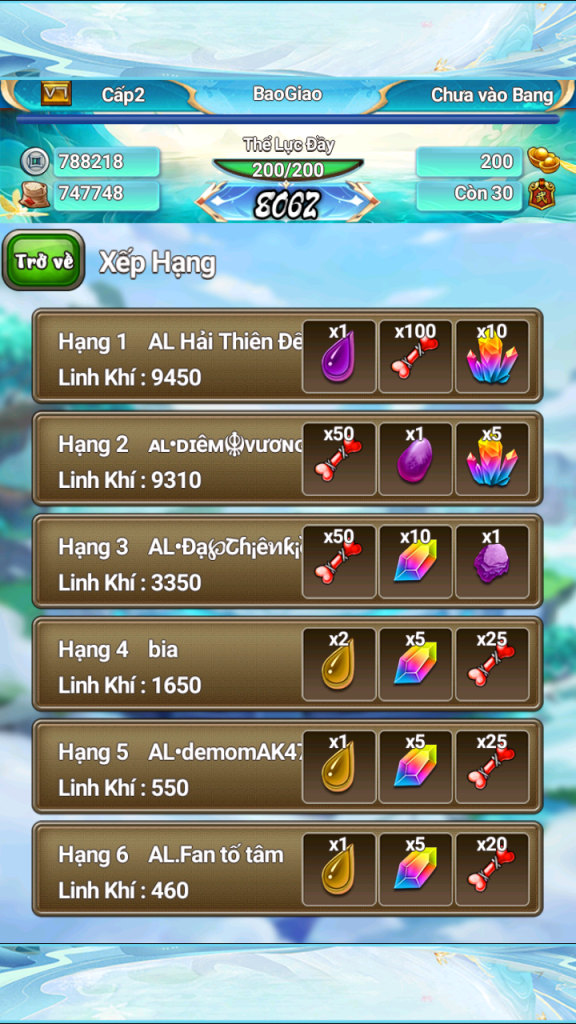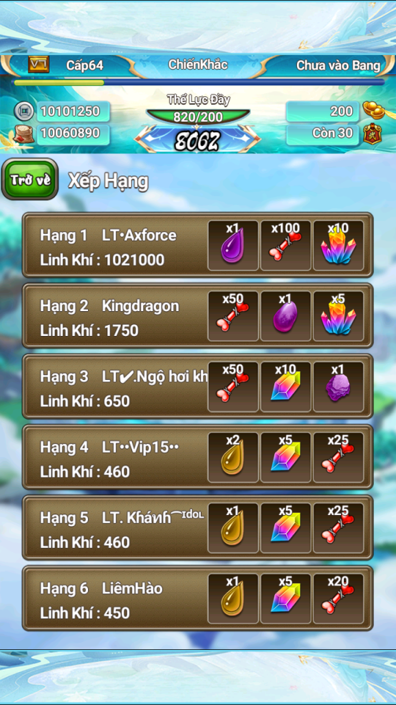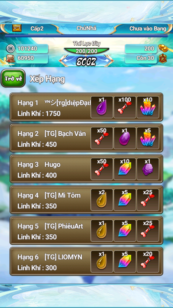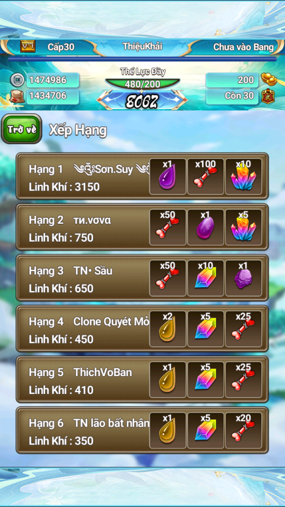 Danh sách top 20 người chơi trên toàn server có số điểm tụ linh cao nhất