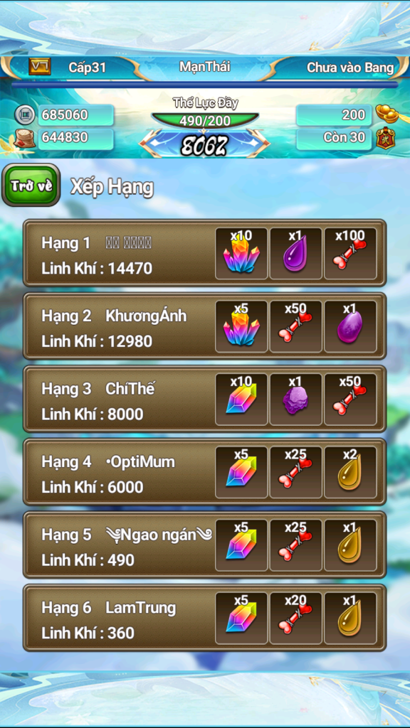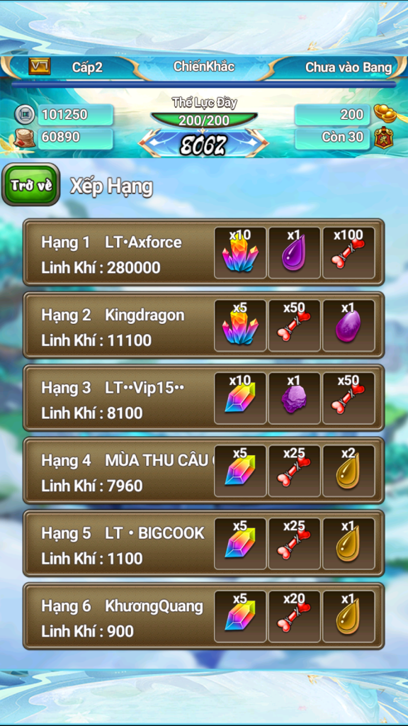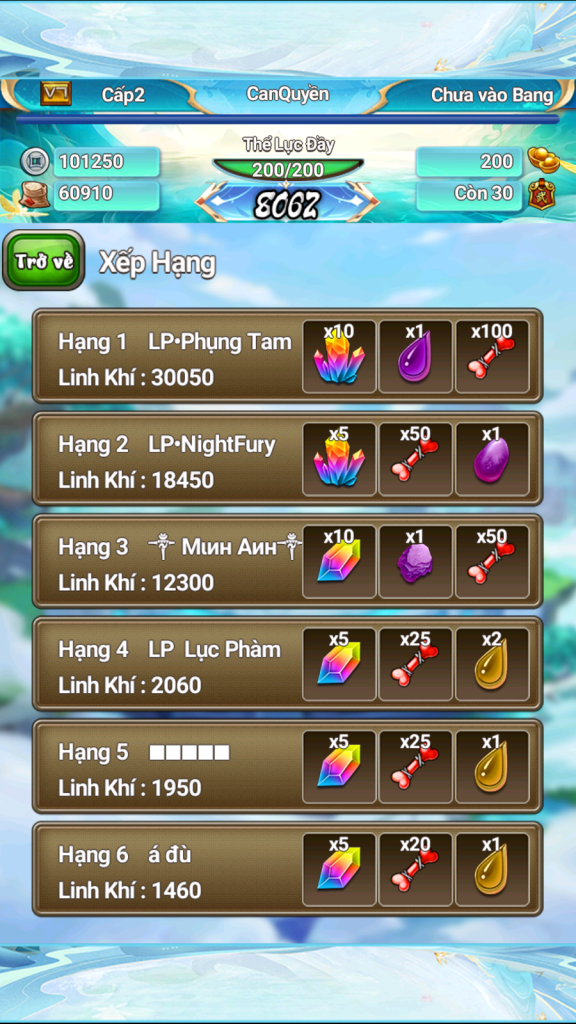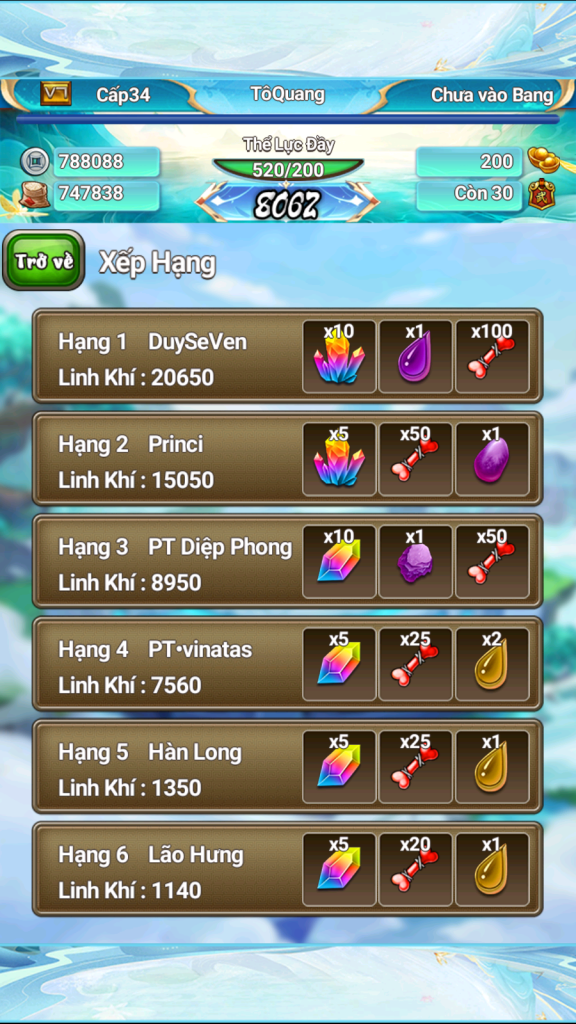 Danh sách top 20 người chơi trên toàn server có số điểm tụ linh cao nhất