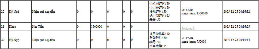 Thời gian nạp & nhận thành công mốc 1.500.000 (tương đương 20.000.000)
