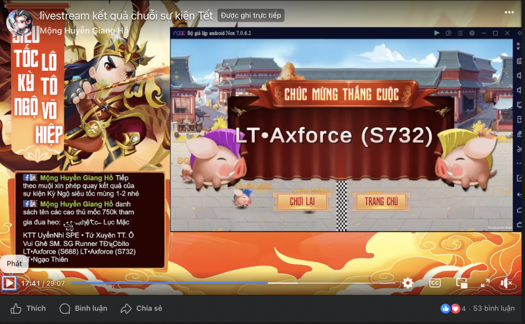 Theo đó, muội đã tiến hành livestream đua heo để tìm ra 1 sư huynh may mắn nhận phần thưởng may mắn của sư kiện và ghi nhận sư huynh may mắn thắng sự kiện là