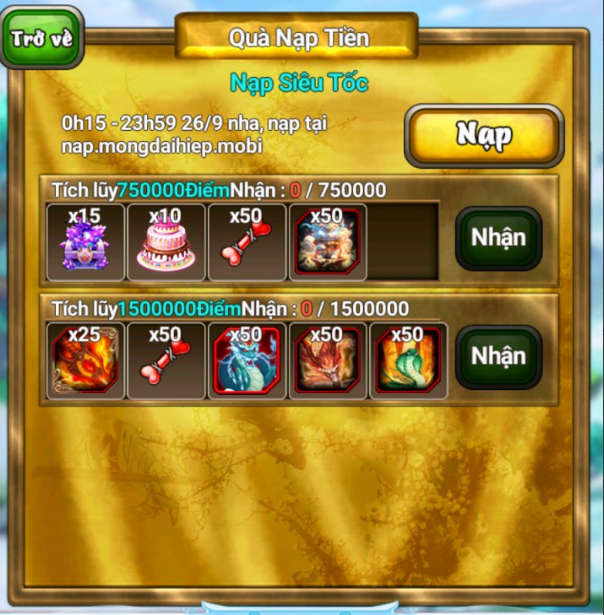 - Bất kỳ người chơi nào trong ngày 26.09 nhận mốc thưởng 1.500.000 của sự kiện Nạp siêu tốc (ingame) sẽ nhận được quà như sau: