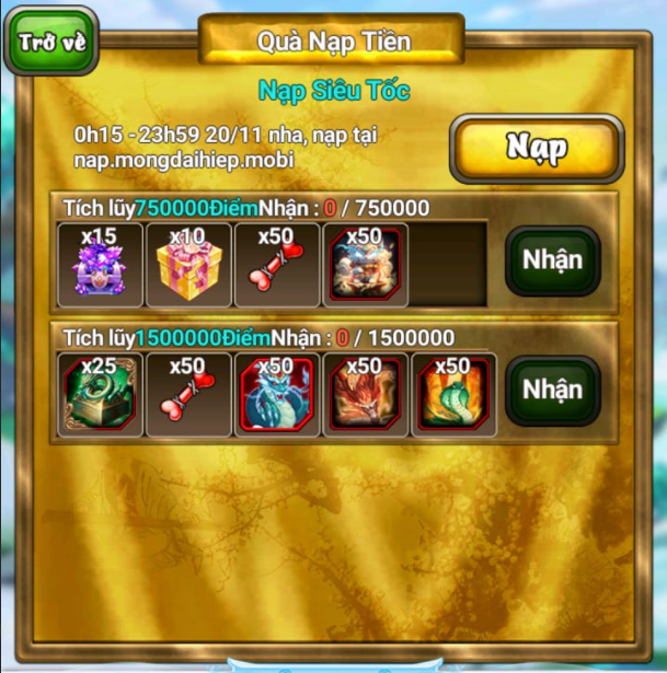 ❀ Người đầu tiên nạp đạt mốc và nhấn nhận thưởng mốc 750.000 và bấm nhận thưởng, người đầu tiên nạp đạt mốc 1.500.000 và bấm nhận thưởng sẽ nhận phần quà tương ứng