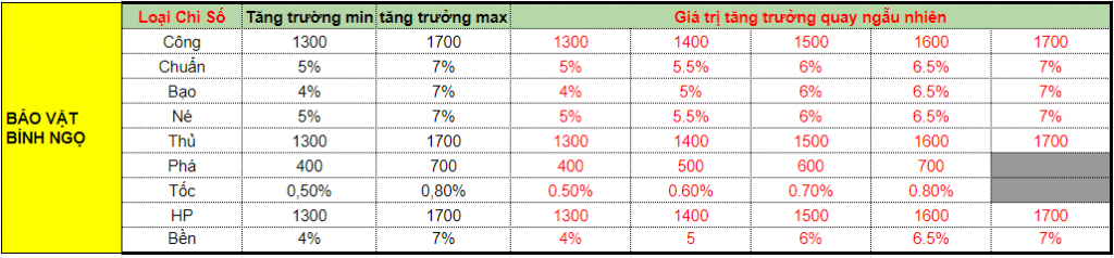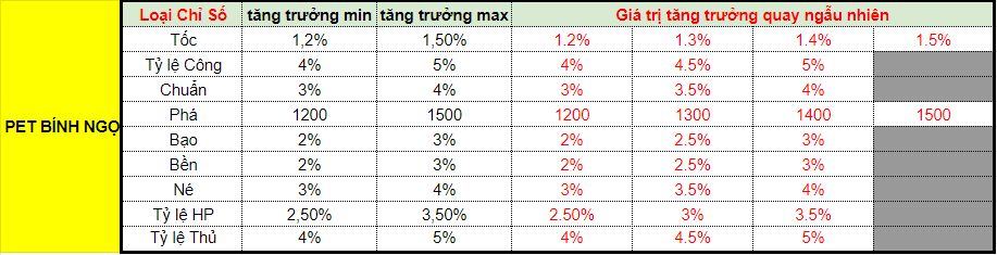 Theo đó, BTC sẽ tiến hành livestream quay chỉ số cho pet và bảo vật Bính Ngọ dựa trên thông tin loại chỉ số và phạm vi giá trị tăng trưởng như sau